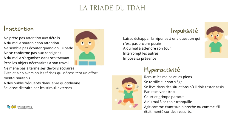 Le TDAH se caractérise par la présence de comportements d’inattention, de comportements d’hyperactivité-impulsivité ou par l’association des deux types de comportements. On ne reconnait pas forcément son enfant Ces comportements doivent être présents avant l’âge de 7 ans et entraîner des difficultés d’adaptation dans au moins deux des environnement de l’enfant, souvent à la maison et à l’école. Une autre pathologie ne doit pas expliquer ces comportements.